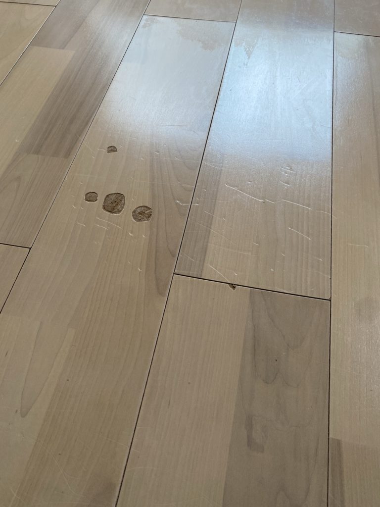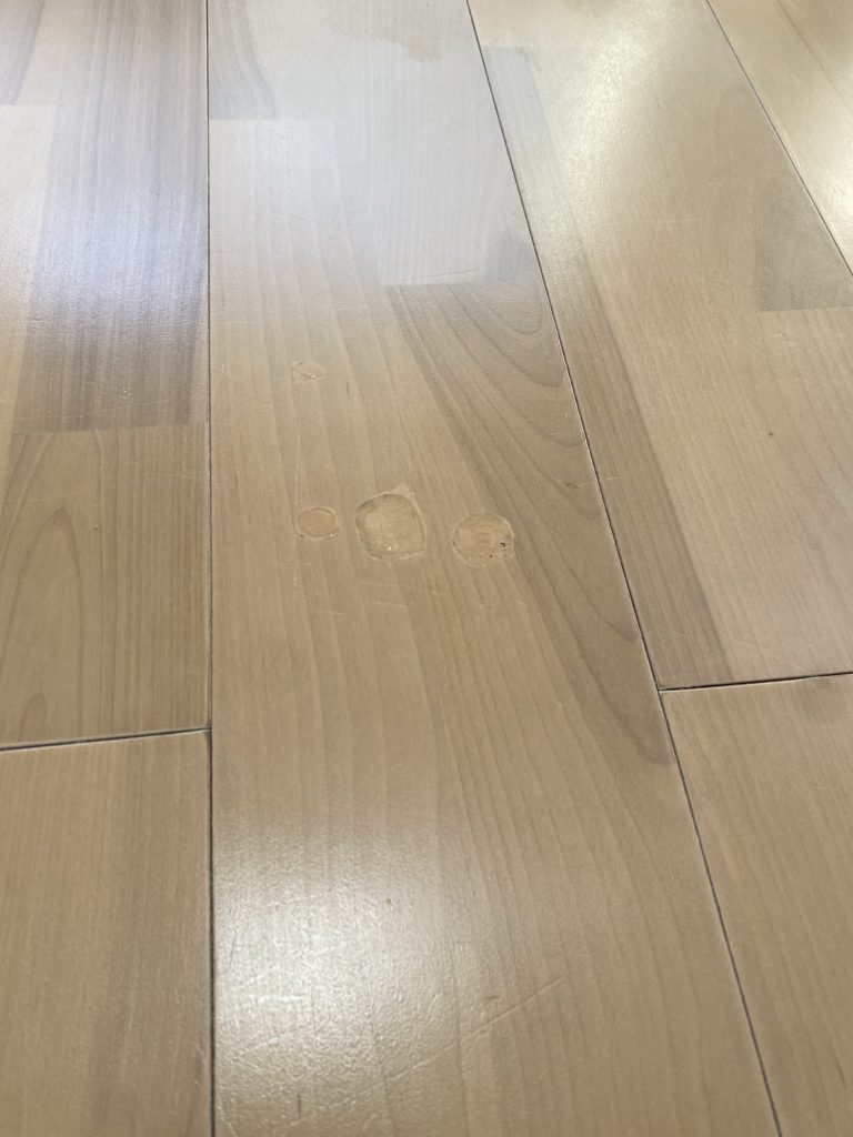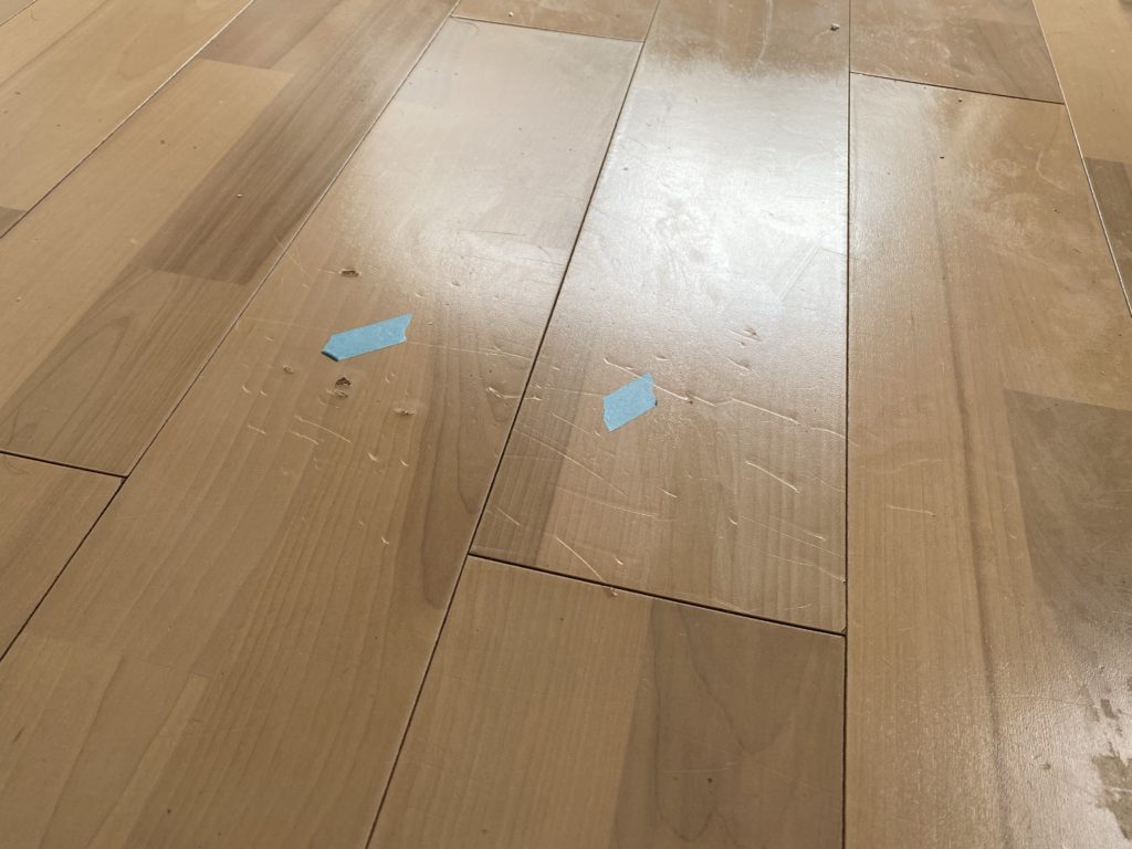 膨れて地板が見えている傷や凹みの線状の傷が多数見受けられました。