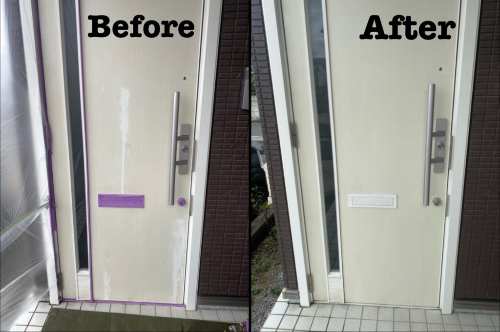 管理会社様より玄関扉についた粘着物や汚れを取るためにつかった薬剤がドアのプリントも溶かしてしまったとのことでした。