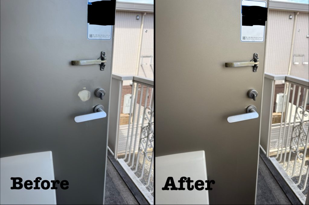 原状回復工事として 玄関扉シートの破れ補修 を行いました。