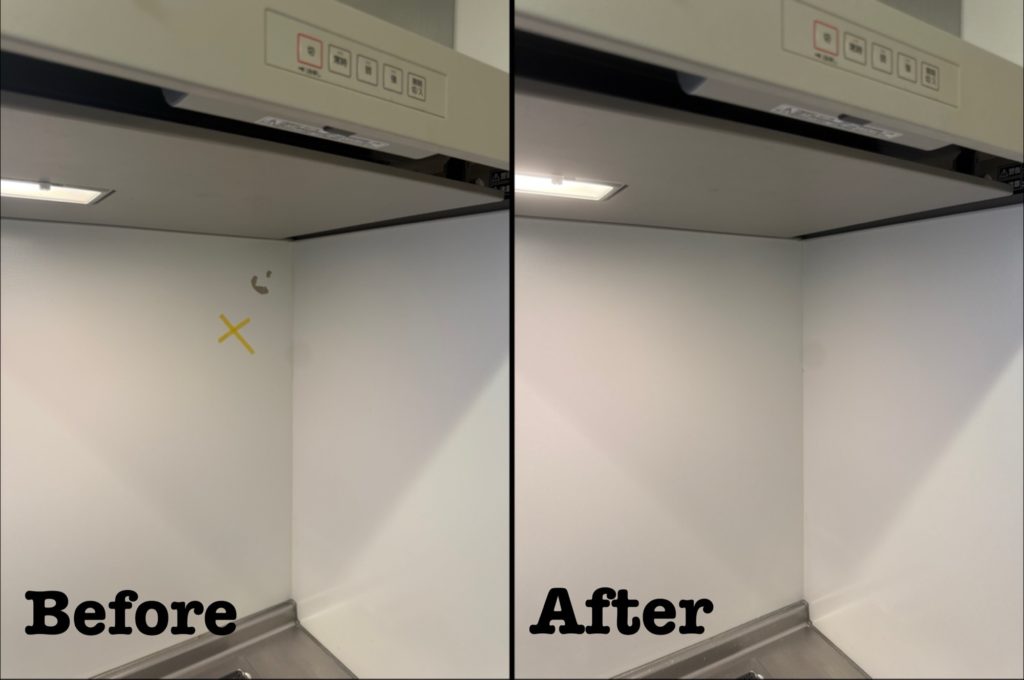 このようなキッチンパネルの案件では、粘着テープ付きのフックを使われていて無理に外そうとして剥がれてしまうケースが多いです。