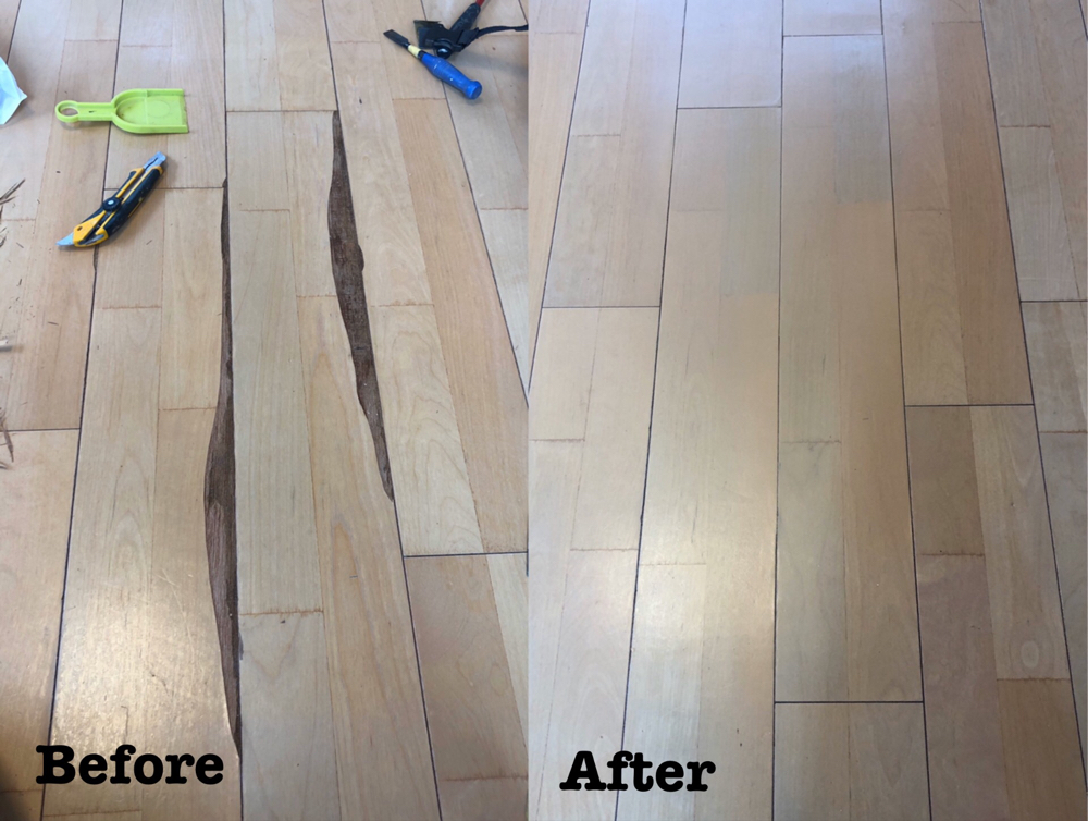 埼玉県上尾市より賃貸物件の原状回復工事にて、フローリングタイヤ痕の補修をさせて頂きました。